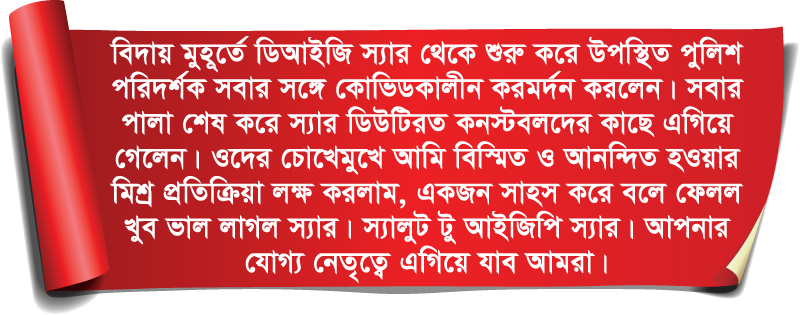 ছবি দুটির ক্যাপশনে তিনি লিখেছেন, ‘বাহিনী প্রধান যখন সর্বকনিষ্ঠ সদস্যর সাথে এভাবে বিদায় নেন নিশ্চয়ই তার জন্য তা অনেক আবেগ ও গর্বের মুহূর্ত তৈরি করে। মান্যবর আইজিপি স্যার গতকাল পাবনার ঈশ্বরদীতে এক সংক্ষিপ্ত সরকারি সফরে আসেন। বিদায় মুহূর্তে ডিআইজি স্যার থেকে শুরু করে উপস্থিত পুলিশ পরিদর্শক সবার সঙ্গে কোভিডকালীন করমর্দন করলেন। সবার পালা শেষ করে স্যার ডিউটিরত কনস্টবলদের কাছে এগিয়ে গেলেন। ওদের চোখেমুখে আমি বিস্মিত ও আনন্দিত হওয়ার মিশ্র প্রতিক্রিয়া লক্ষ করলাম, একজন সাহস করে বলে ফেলল খুব ভাল লাগল স্যার। স্যালুট টু আইজিপি স্যার। আপনার যোগ্য নেতৃত্বে এগিয়ে যাব আমরা।’