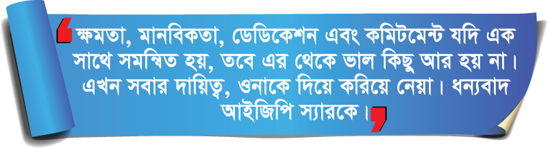 মেহেদী হাসান শাওন লিখেছেন, ‘অসাধারণ লাগলো ব্যাপারটা। এতে নিম্নপদস্থ কর্মচারীদের মনোবল চাঙা হয়। স্যালুট মাননীয় আইজিপি স্যার। স্যারের ব্যাক্তিত্ব ছড়িয়ে পড়ুক সকল সিনিয়র স্যারদের মাঝে এই কামনা করি। বিষয়টা সুন্দরভাবে ফুটিয়ে তোলার জন্য অসংখ্য ধন্যবাদ প্রিয় মানবিক পুলিশ সুপার মুহিবুল স্যারকে।’