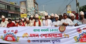 যথাযোগ্য মর্যাদা ও আনন্দঘন পরিবেশে আজ (শুক্রবার) খুলনায় বাংলা নববর্ষ-১৪৩০ উদযাপিত হয়। খুলনা জেলা প্রশাসন আয়োজিত অনুষ্ঠানের মধ্যে ছিলো বর্ণাঢ্য মঙ্গল শোভাযাত্রার উদ্বোধন, পুরস্কার বিতরণ ও সাংস্কৃতিক অনুষ্ঠান।
