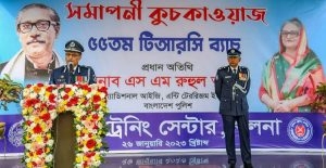 বাংলাদেশ পুলিশের ৫৫তম ট্রেইনি রিক্রুট কনস্টেবল ব্যাচের ৮৮৫ জন প্রশিক্ষণার্থীর প্রশিক্ষণ সমাপনী ও কুচকাওয়াজ আজ (বৃহস্পতিবার) সকালে খুলনা পুলিশ ট্রেনিং সেন্টার প্যারেড গ্রাউন্ডে অনুষ্ঠিত হয়। অনুষ্ঠানে বাংলাদেশ পুলিশের এন্টি টেররিজম ইউনিটের অ্যাডিশনাল আইজি এস এম রুহুল আমিন প্রধান অতিথি হিসেবে উপস্থিত থেকে মনোজ্ঞ কুচকাওয়াজে সালাম গ্রহণ করেন। পরে তিনি কৃতি প্রশিক্ষণার্থীদের মাঝে ট্রফি প্রদান করেন।