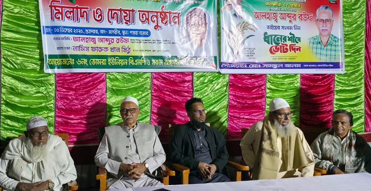বাংলাদেশ জাতীয়তাবাদী দল বিএনপি চেয়ারপারসন বিএনপির চেয়ারপার্সন ও ৩ বারের সাবেক সফল প্রধানমন্ত্রী, গণতন্ত্রের আপোষহীন নেত্রী, দেশনেত্রী বেগম খালেদা জিয়ার শারীরিক সুস্থতা ও দীর্ঘায়ু কামনায় মিলাদ ও দোয়া অনুষ্ঠান অনুষ্ঠিত হয়েছে। শুক্রবার (০৫ ডিসেম্বর) রাতে ভোমরা ইউনিয়নের শাঁখরা বাজারে ভোমরা ইউনিয়ন বিএনপি ও সকল অঙ্গ সহযোগী সংগঠনের আয়োজনে ভোমরা ইউনিয়ন বিএনপির সাধারণ সম্পাদক মো. বজলুর রহমানের সভাপতিত্বে মিলাদ ও দোয়া অনুষ্ঠানে প্রধান অতিথি হিসেবে বক্তব্য রাখেন সাতক্ষীরা জেলা বিএনপির সাবেক সিনিয়র যুগ্ম আহবায়ক ও সাতক্ষীরা-২ আসনের জাতীয়তাবাদী দল বিএনপি মনোনীত ধানের শীষের কান্ডারী আলহাজ্ব মো. আব্দুর রউফ। প্রধান অতিথির বক্তব্যে তিনি বলেন, দেশনেত্রী বেগম খালেদা জিয়ার সুস্থতা কামনায় আপনারা সকলে নামাজে অন্তে দোয়া করবেন। মহান আল্লাহ যেন দেশনেত্রী বেগম খালেদা জিয়াকে সুস্থ করে আমাদের মাঝে ফিরিয়ে দেন।
