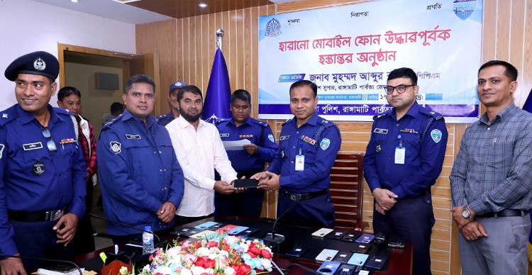 রাঙ্গামাটি জেলা পুলিশের সাইবার ক্রাইম মনিটরিং সেলের সফল প্রচেষ্টায় ৫০ টি হারিয়ে যাওয়া মোবাইল ফোন উদ্ধার পূর্বক প্রকৃত মালিকের নিকট হস্তান্তর করা হয়েছে।আজ ১৭ ডিসেম্বর ২০২৫ খ্রি: রাঙ্গামাটি পুলিশ সুপারের কার্যালয় সম্মেলন কক্ষে হারানো মোবাইল ফোন উদ্ধারপূর্বক প্রকৃত মালিকদের নিকট হস্তান্তর অনুষ্ঠানে সভাপতিত্ব করেন রাঙ্গামাটি পার্বত্য জেলার পুলিশ সুপার মুহম্মদ আব্দুর রকিব, পিপিএম।