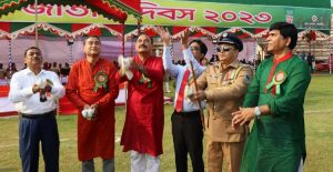 বাংলাদেশের জাতীয় পতাকা উত্তোলন, কবুতর অবমুক্ত ও আকাশে বেলুন-ফেস্টুন উড্ডয়ন করেন সাতক্ষীরা জেলার বিঞ্জ জেলা ম্যাজিস্ট্রেট ও জেলা প্রশাসক মোহাম্মদ হুমায়ুন কবির এবং জেলা পুলিশ সুপার কাজী মনিরুজ্জামান পিপিএম।