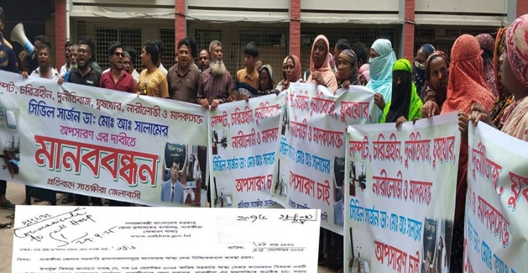 সাতক্ষীরার সিভিল সার্জন ডাঃ আব্দুস সালামের অপসারণের দাবিতে মানববন্ধন ও সিভিল সার্জন অফিস ঘেরাও কর্মসূচি পালিত হয়েছে জেলাবাসীর ব্যানারে । সোমবার(০৬ অক্টোবর) সকাল ১১টায় এই মানববন্ধন ও ঘেরাও কর্মসূচি অনুষ্ঠিত হয়েছে এবং পুলিশ ঘটনা স্থানে গিয়ে পরিস্থিতি নিয়ন্ত্রণ করে তাদেরকে ফিরিয়ে দিয়েছে বলে জানা গেছে।