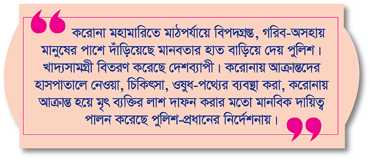 করোনা মহামারিতে মাঠপর্যায়ে বিপদগ্রস্ত, গরিব-অসহায় মানুষের পাশে দাঁড়িয়ে মানবতার হাত বাড়িয়ে দেয় পুলিশ। খাদ্যসামগ্রী বিতরণ করেছে দেশব্যাপী। করোনায় আক্রান্তদের হাসপাতালে নেওয়া, চিকিৎসা, ওষুধ-পথ্যের ব্যবস্থা করা, করোনায় আক্রান্ত হয়ে মৃত ব্যক্তির লাশ দাফন করার মতো মানবিক দায়িত্ব পালন করেছে পুলিশপ্রধানের নির্দেশনায়।
