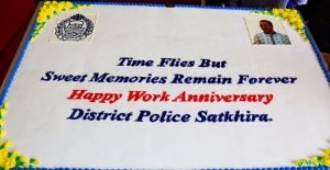 সাতক্ষীরা জেলা পুলিশ সুপার কাজী মনিরুজ্জামান পিপিএম এঁর সাতক্ষীরা জেলায় ১ বছর পূর্তি উপলক্ষে জেলা পুলিশ, সাতক্ষীরা পক্ষ থেকে ফুলেল শুভেচ্ছা জানানো হয়েছে এবং কেট কেটে হ্যাপি ওয়ারর্ক এ্যানিভার্সারী পালন করেছে সাতক্ষীরা জেলা পুলিশ।