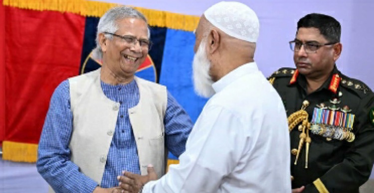 রাজধানীর সেনাকুঞ্জে সশস্ত্র বাহিনী দিবস উপলক্ষে আয়োজিত অনুষ্ঠানে অন্তবর্তী সরকারের প্রধান উপদেষ্টা অধ্যাপক ড. মুহাম্মদ ইউনূসের সঙ্গে সৌজন্য বিনিময় করেন বাংলাদেশ জামায়াতে ইসলামীর আমির ডা. শফিকুর রহমান।